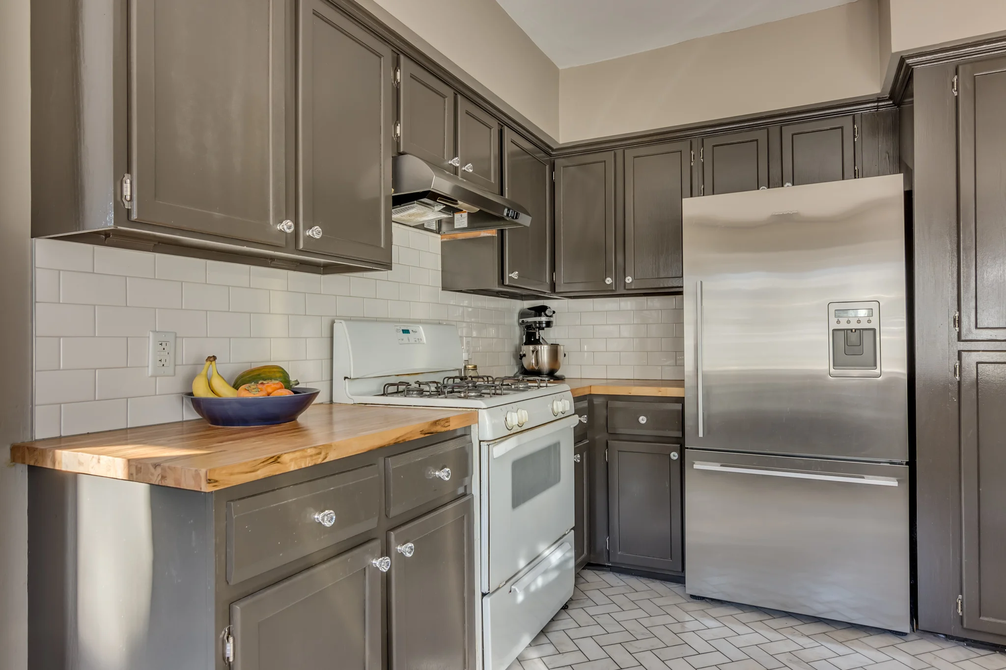 counter to ceiling subways, oak butcher block with annual poly coats.