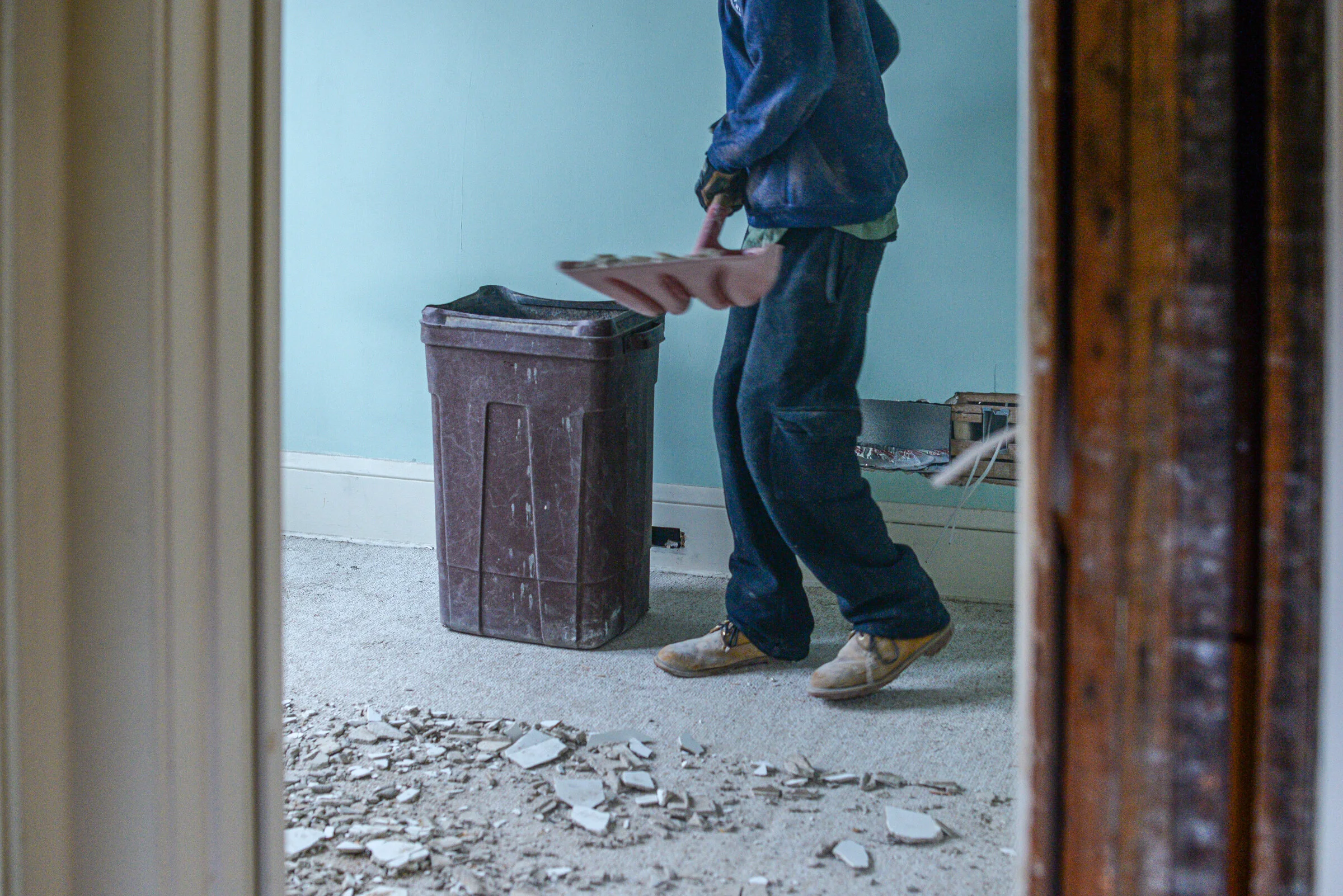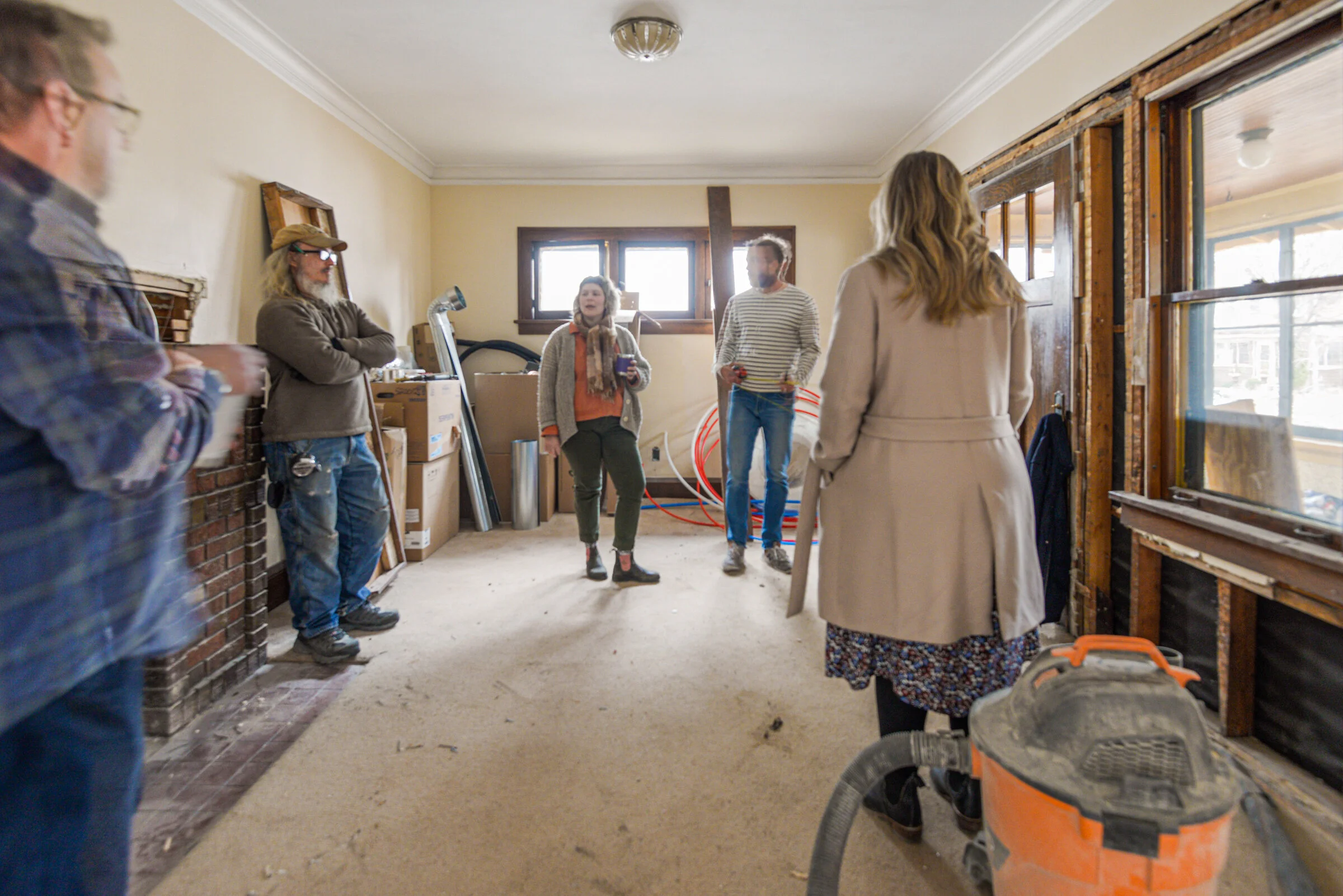 The trades who commanded this project were steadfast and dedicated for the entire 9 month remodel. This photo below was one of the many discussions over altering the foyer entry point to the bungalow.