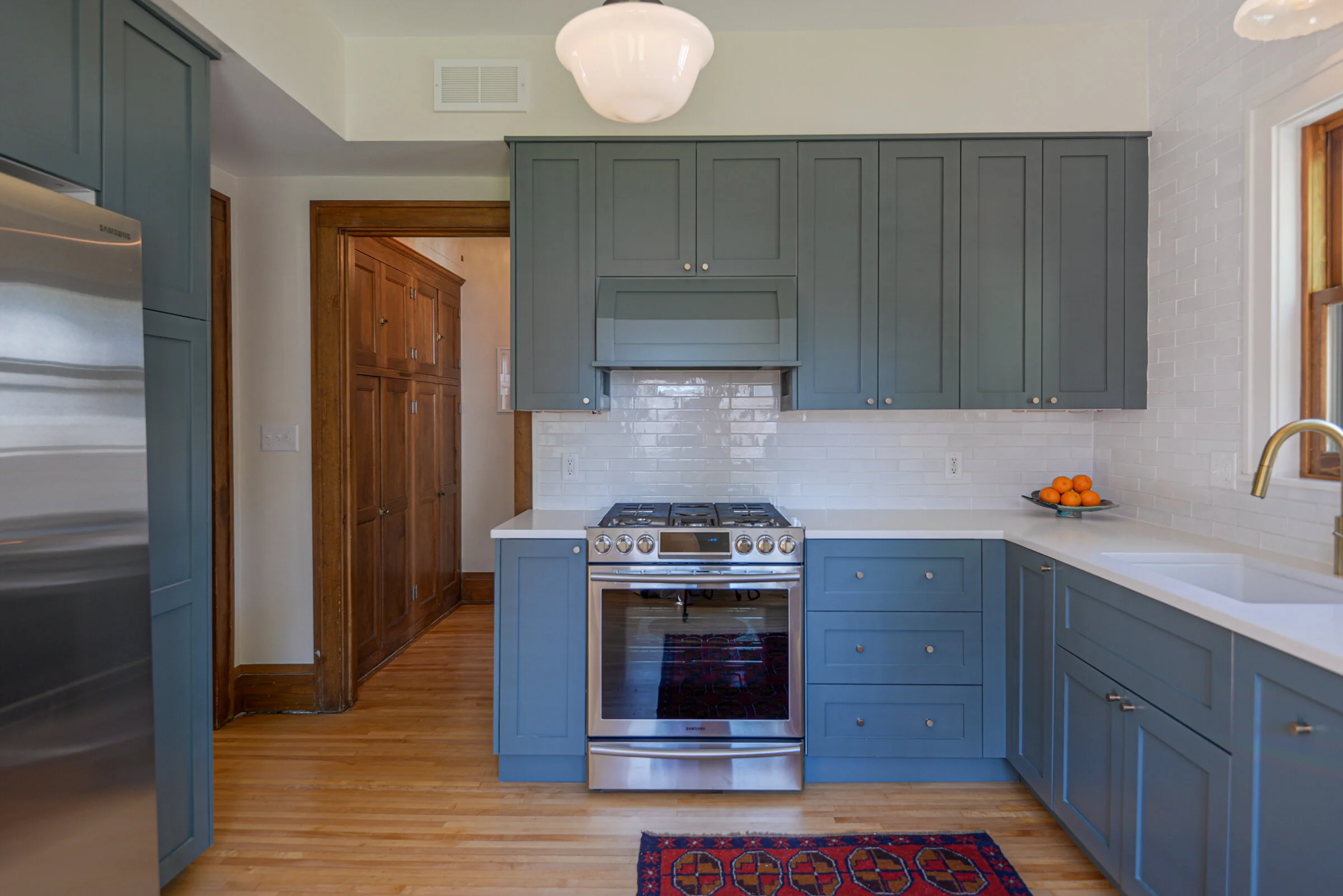 The selections were captained by Deidre Webster: a timeless enamel over semi-handmade with quartz tops under high-fired glazed terracotta tile, paneled Bosch & commercial range and modern go-go-gadget fridge. The long countertop run extends over a cast radiator offering a life station that doubles as a stool perch to keep the chef company with his guests.