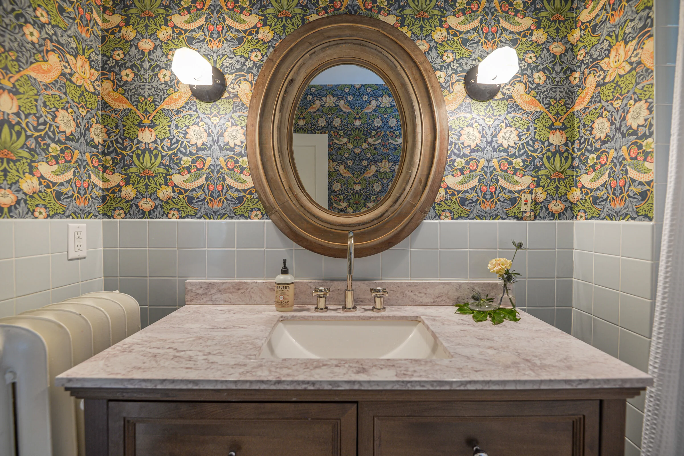curated full upper bath which is spacious & period blended MCM blue squares with modern wallpaper and casted milk glass sconces