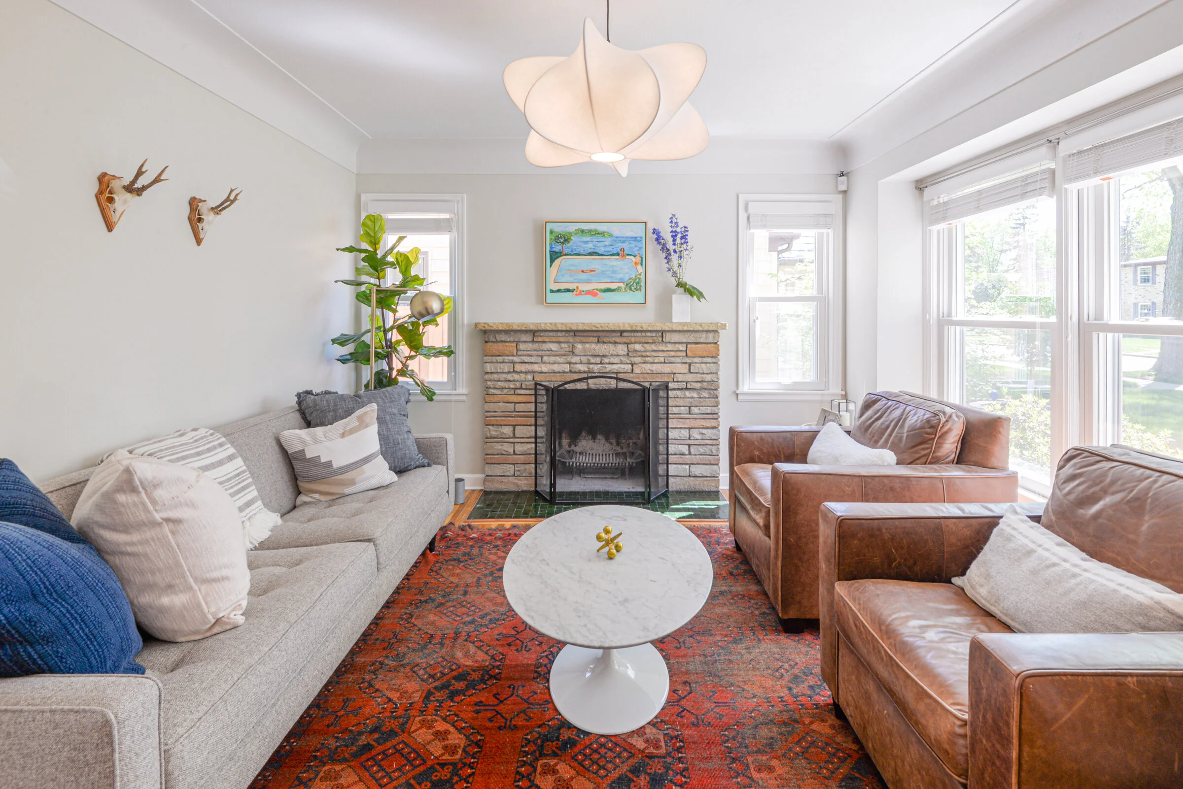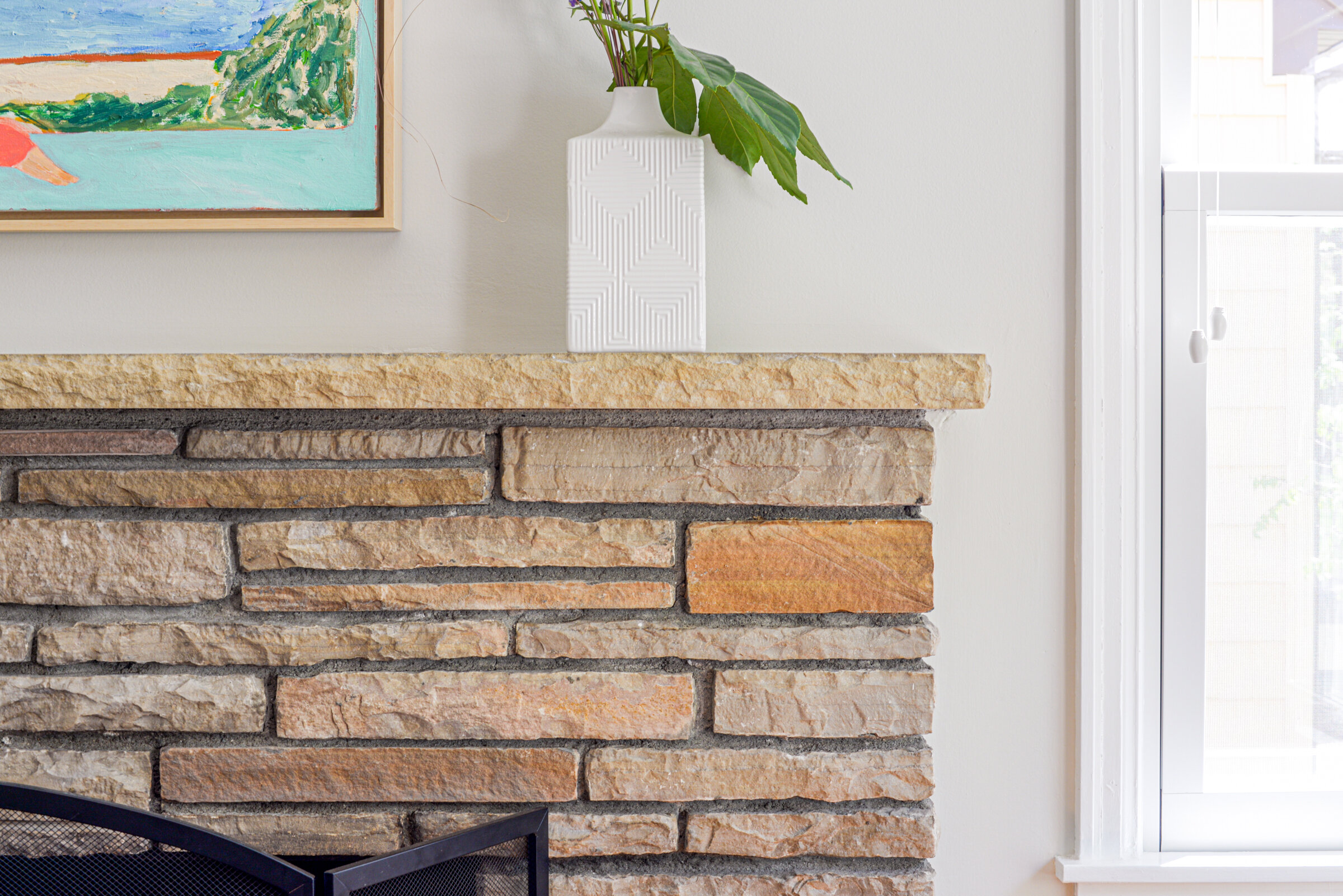 We chose a green tile for the fireplace hearth to complement the warm red undertones of the stone to replace the big box solution that was previously there. Since the home was built in 1949, we made the decision to include contemporary lighting that nods at the mid-century era of the home throughout the space.