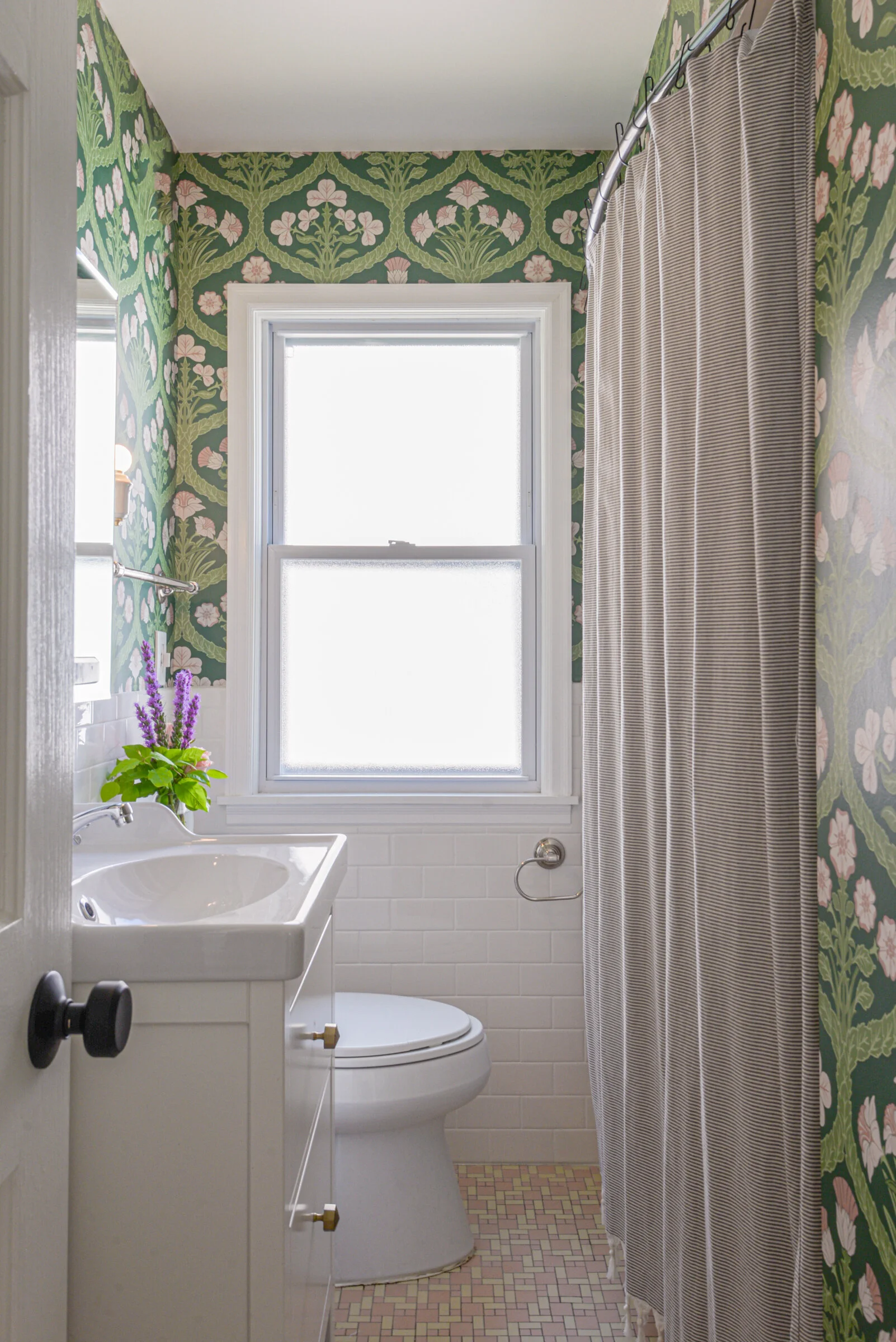 Wallpaper is not solely about making something look good; it’s about making the next owner of record love and embrace the original features of the home. The paper we chose for the bathroom is a modernized vintage pattern. The floral print nods at trends from the 30s and 40s but is updated with the color palette and large scale.