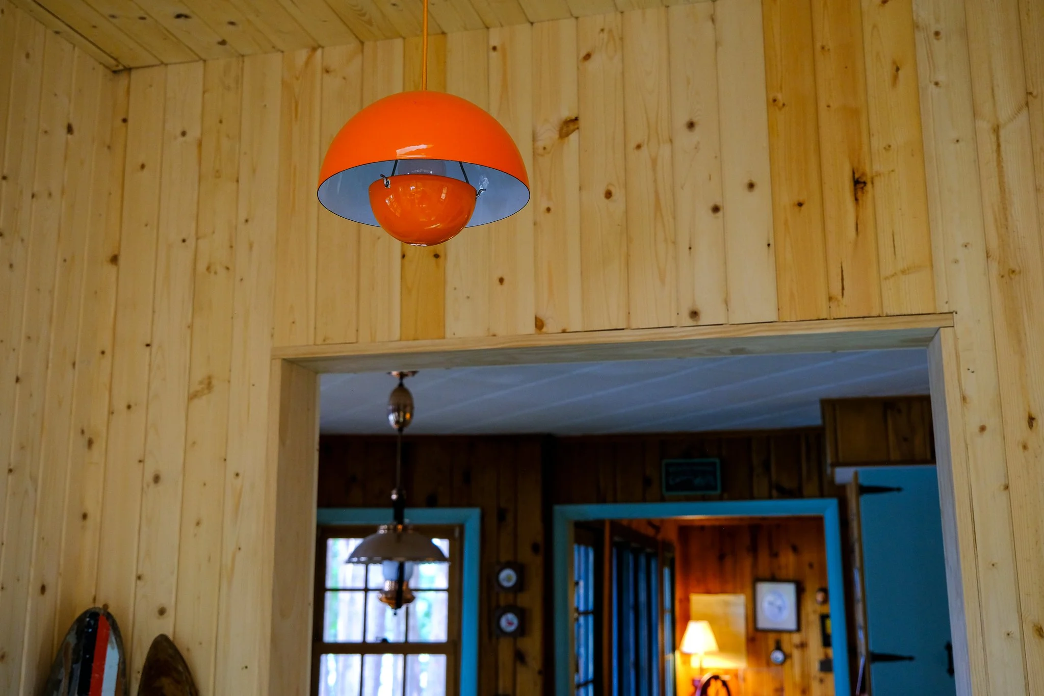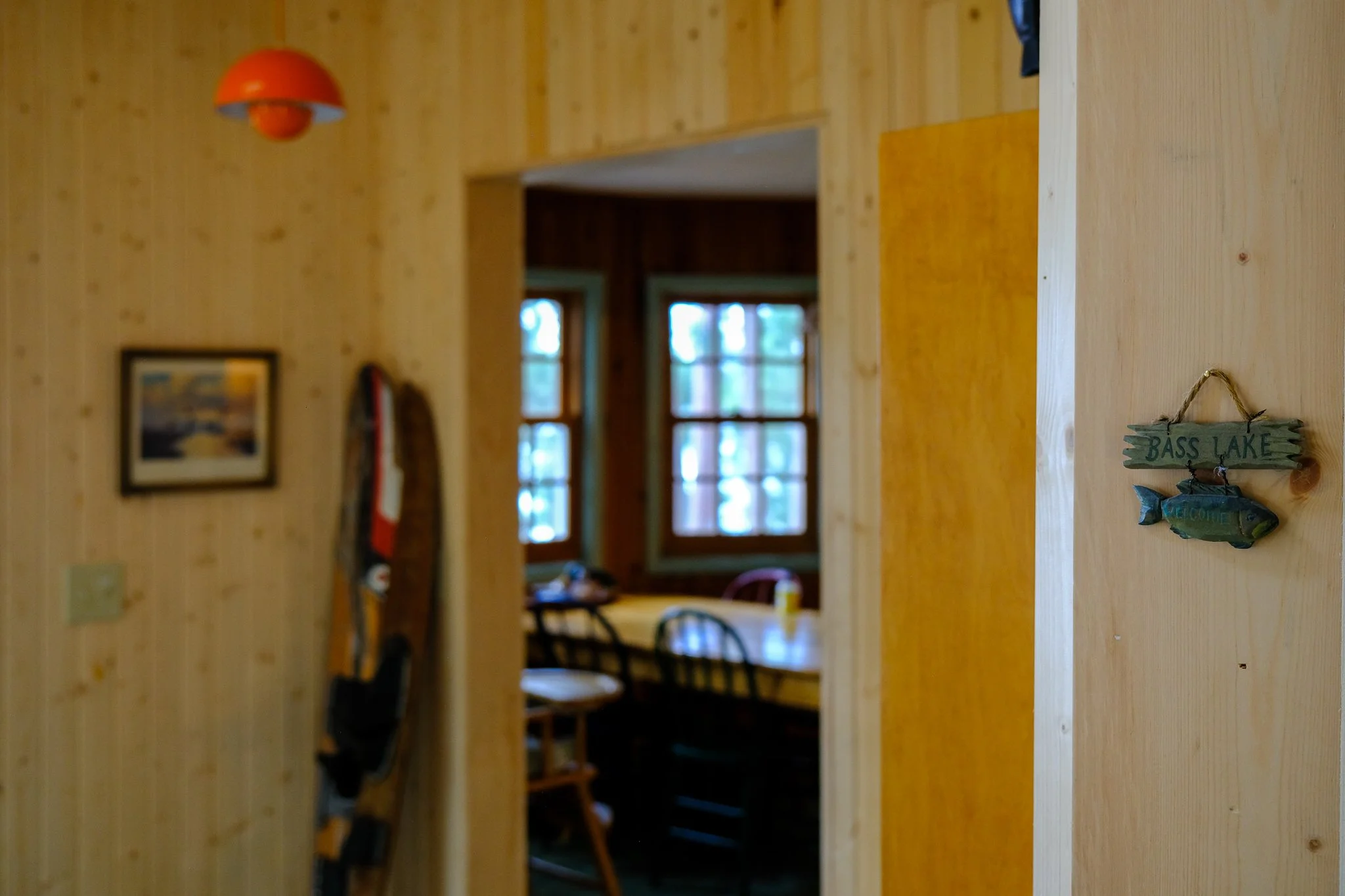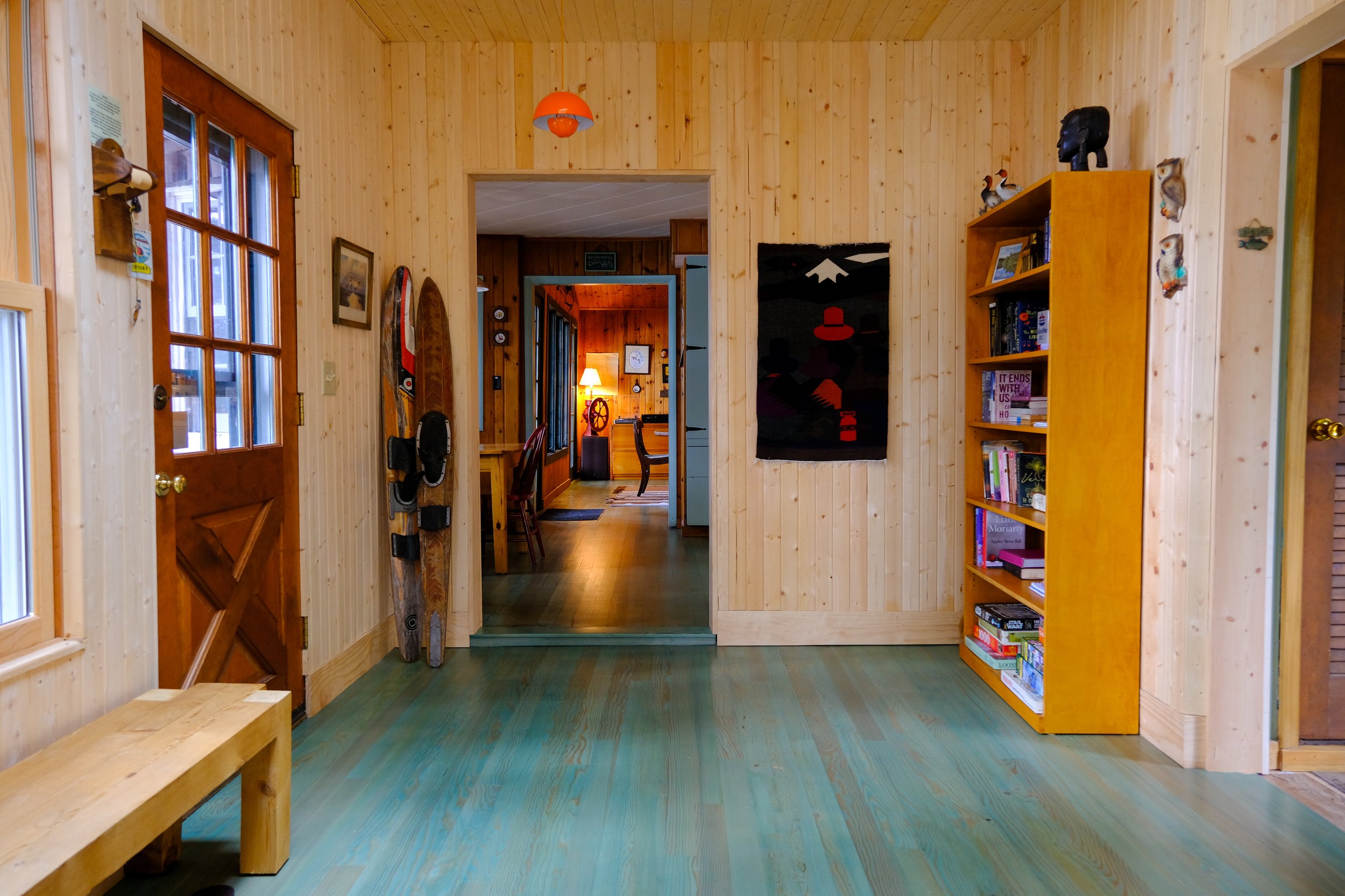 the hifi system was placed over the game table to send sound throughout the cabin, and our collection of records will grow by the season. the sleeping rooms are split three off the main lodge room all with plaid carpet & modern fans to bring the cool lake air in.