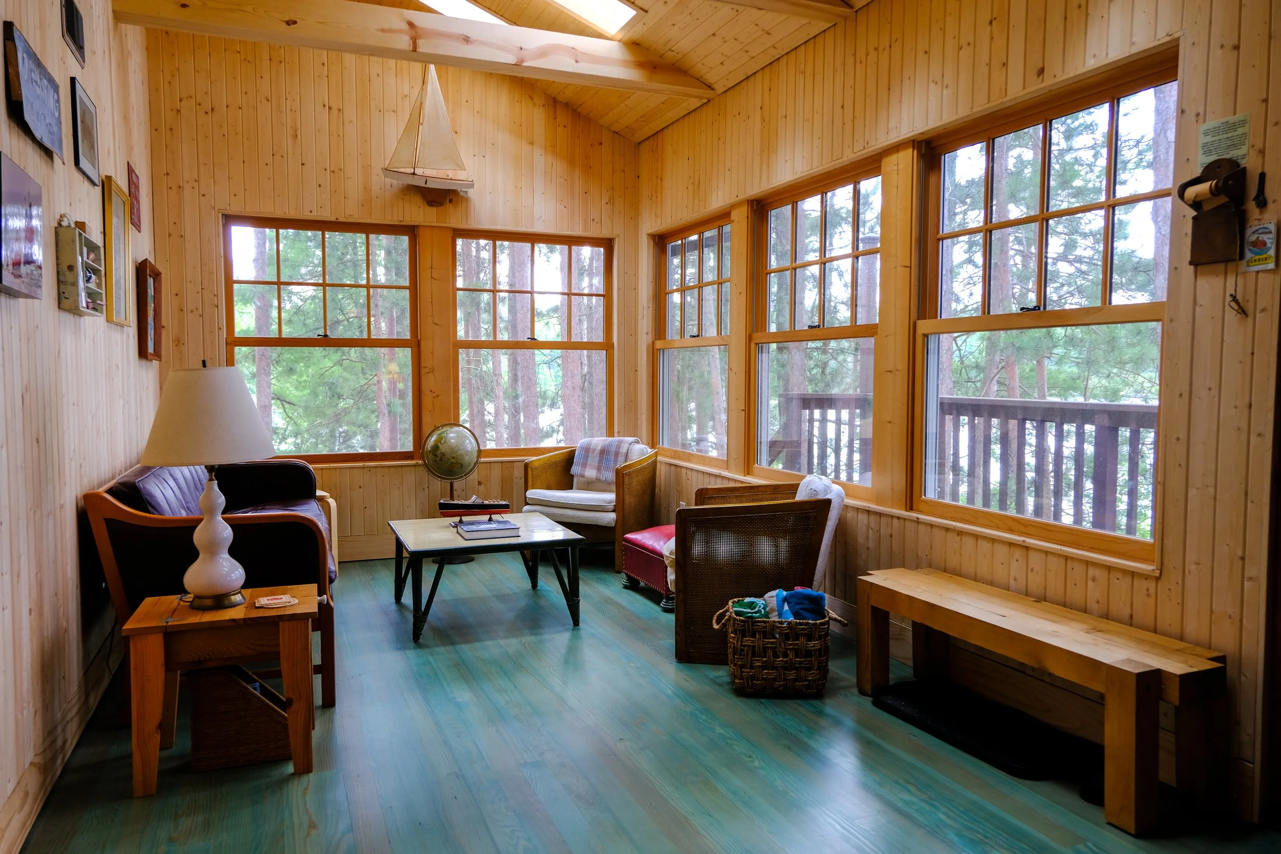 sunroom revival- the sunroom was formerly an office space drop ceiling, we vaulted this space and foamed its entirety for winter enjoyment adding 5 skylights to bring the treetops into the space. finished in floor to ceiling in narrow milled sauna paneling pine.