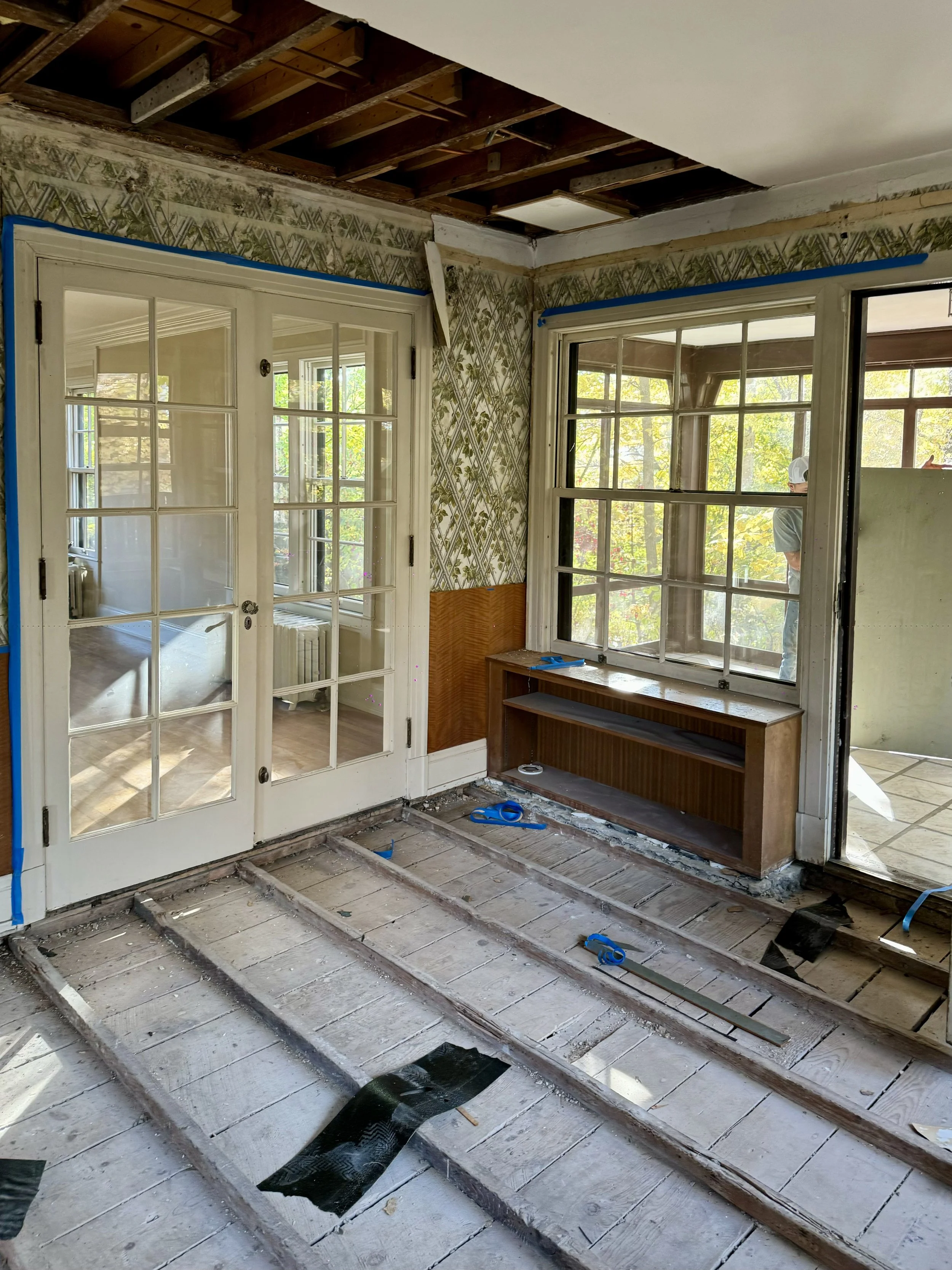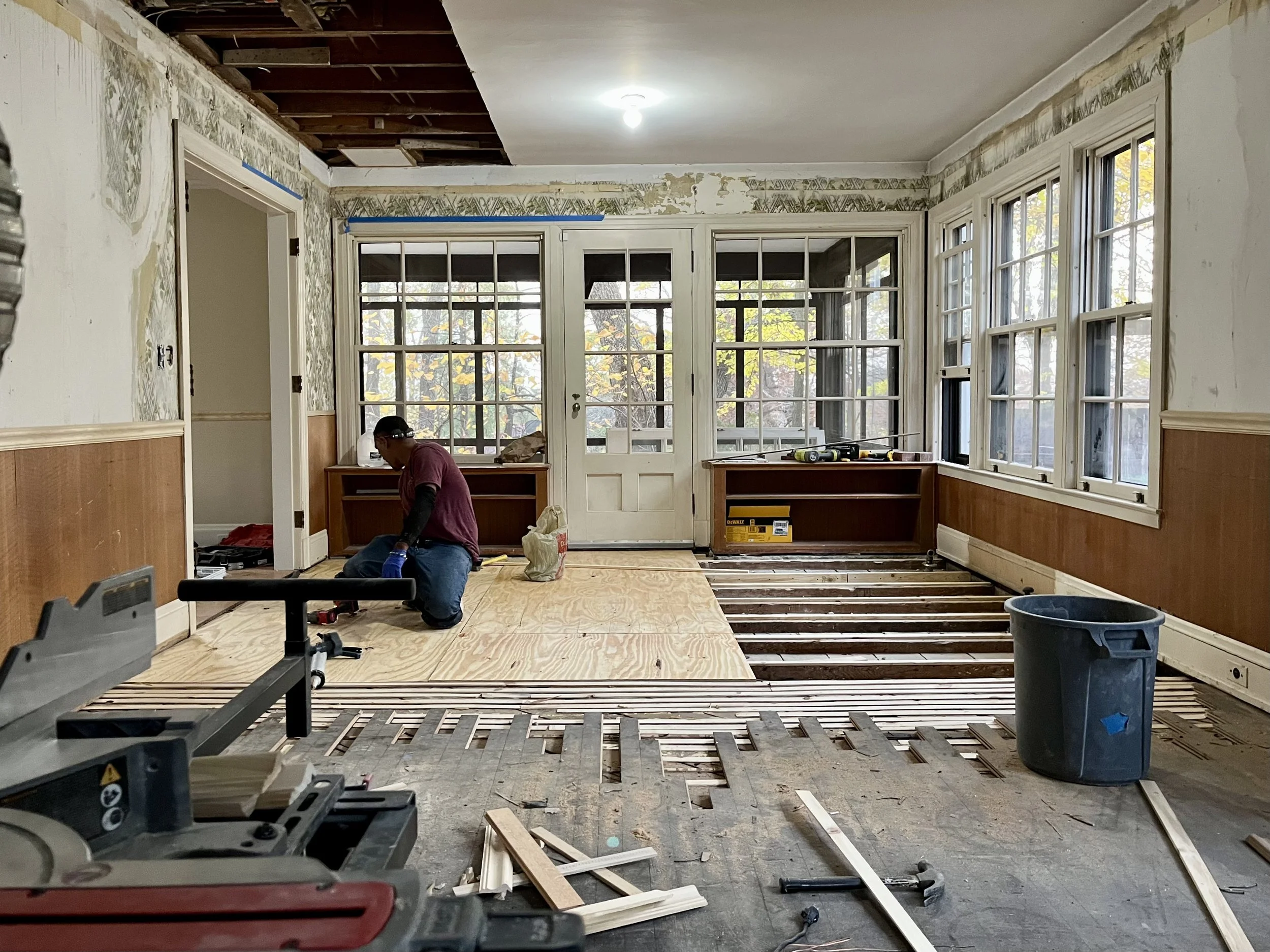 Weaving in quartersawn white oak boards post tile and subfloor demo.