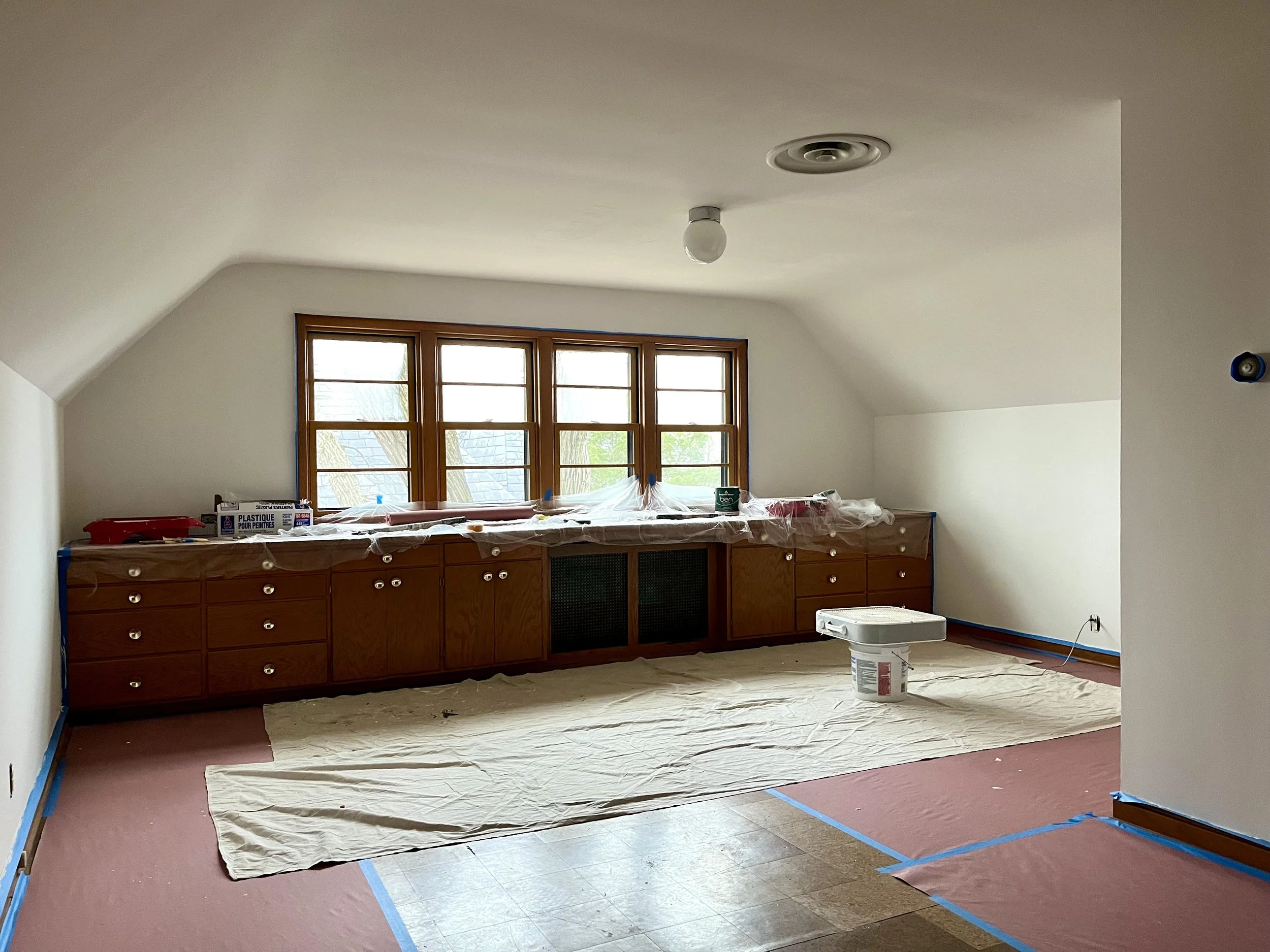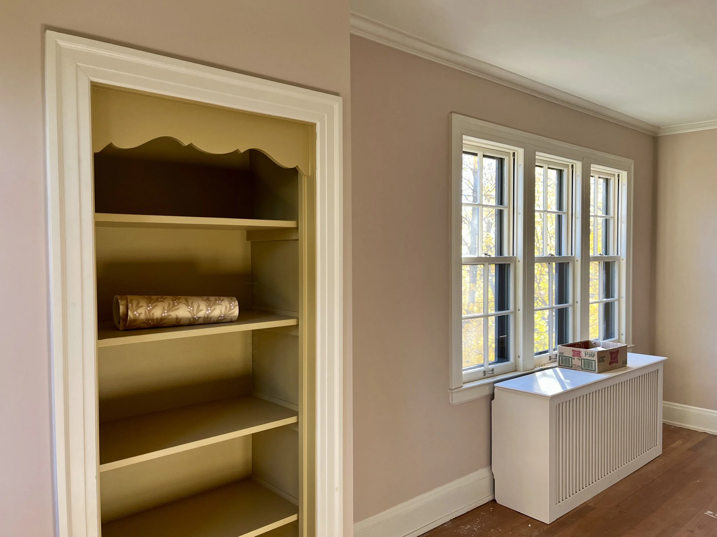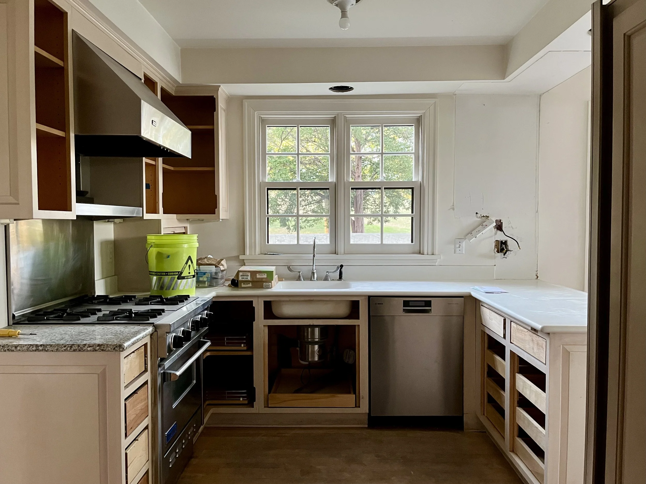 The kitchen enjoys unobstructed views of the Washburn water tower with the boughs of old oaks framing those sightlines. We removed two banks of upper cabinets to give the space a feeling of levity. In their place we installed ample 5/4 inch white oak open shelves and finished those in a proprietary stain blend. When complete the kitchen will feature caramel- and olive-veined stone counters paired with deep sage enamel, cream paneling, and the rich living finish of aged brass hardware – all in harmony with the great oaks just beyond.