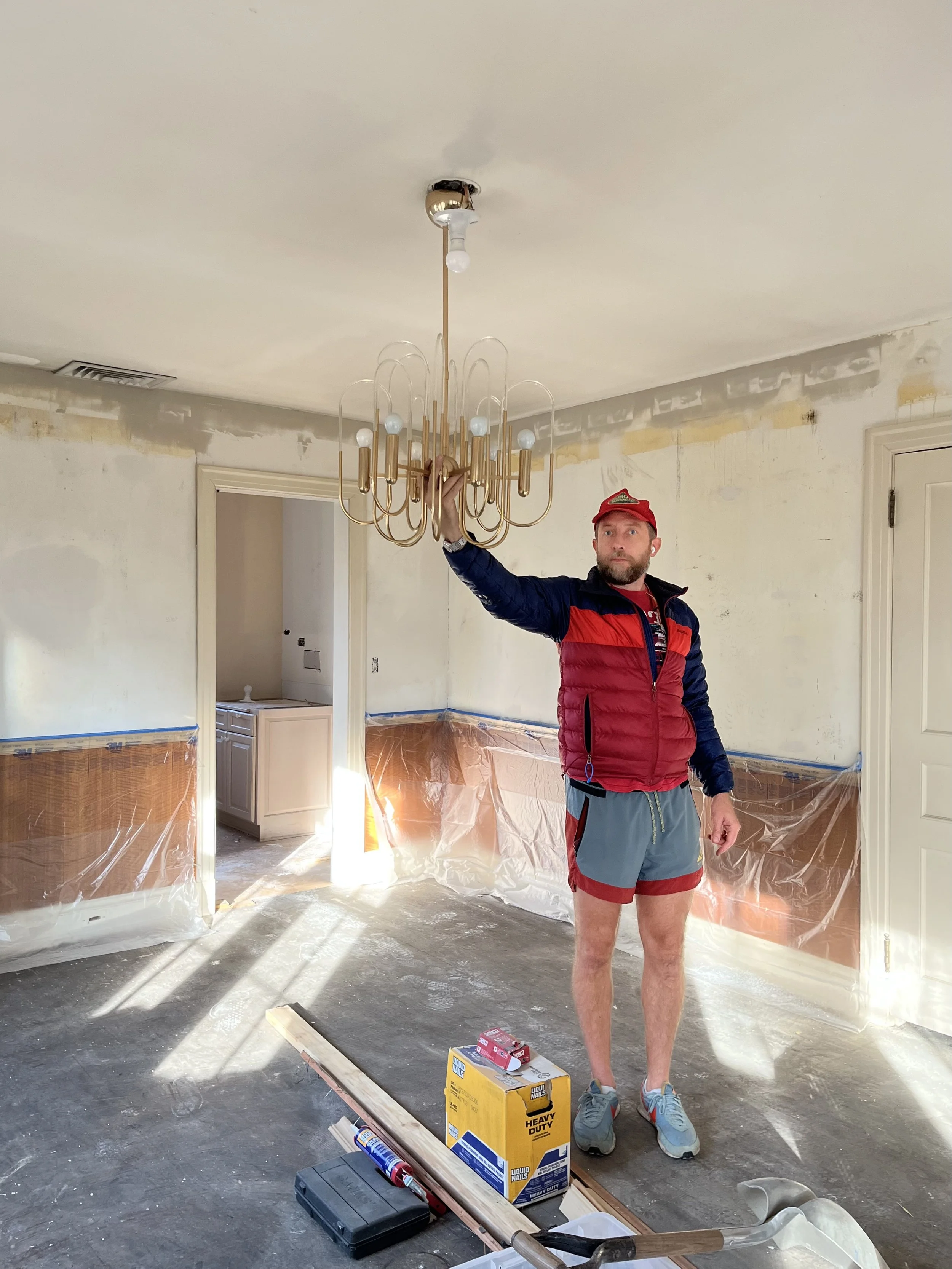 Mid-century Sciolari chandelier lending a touch of glamor to the job site.