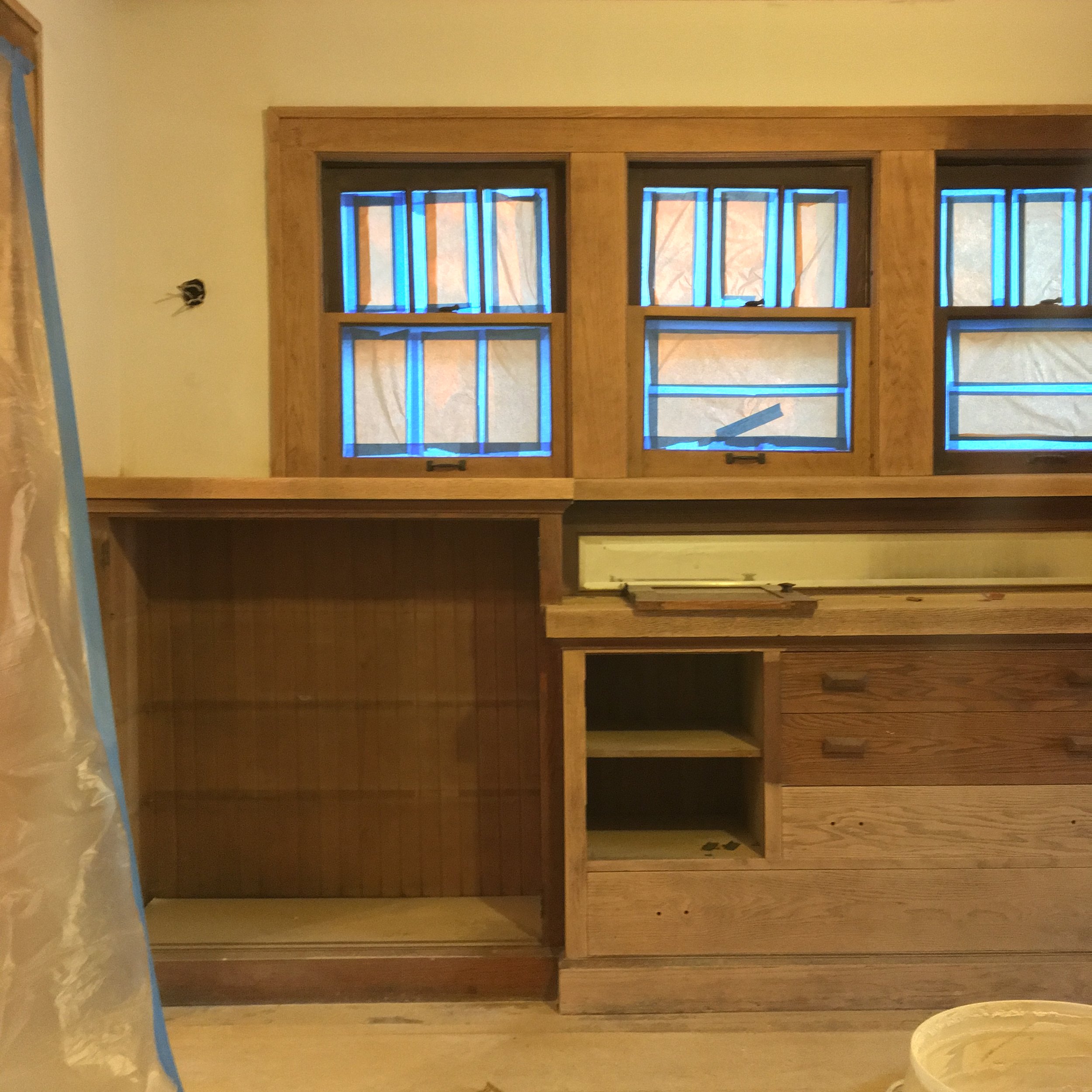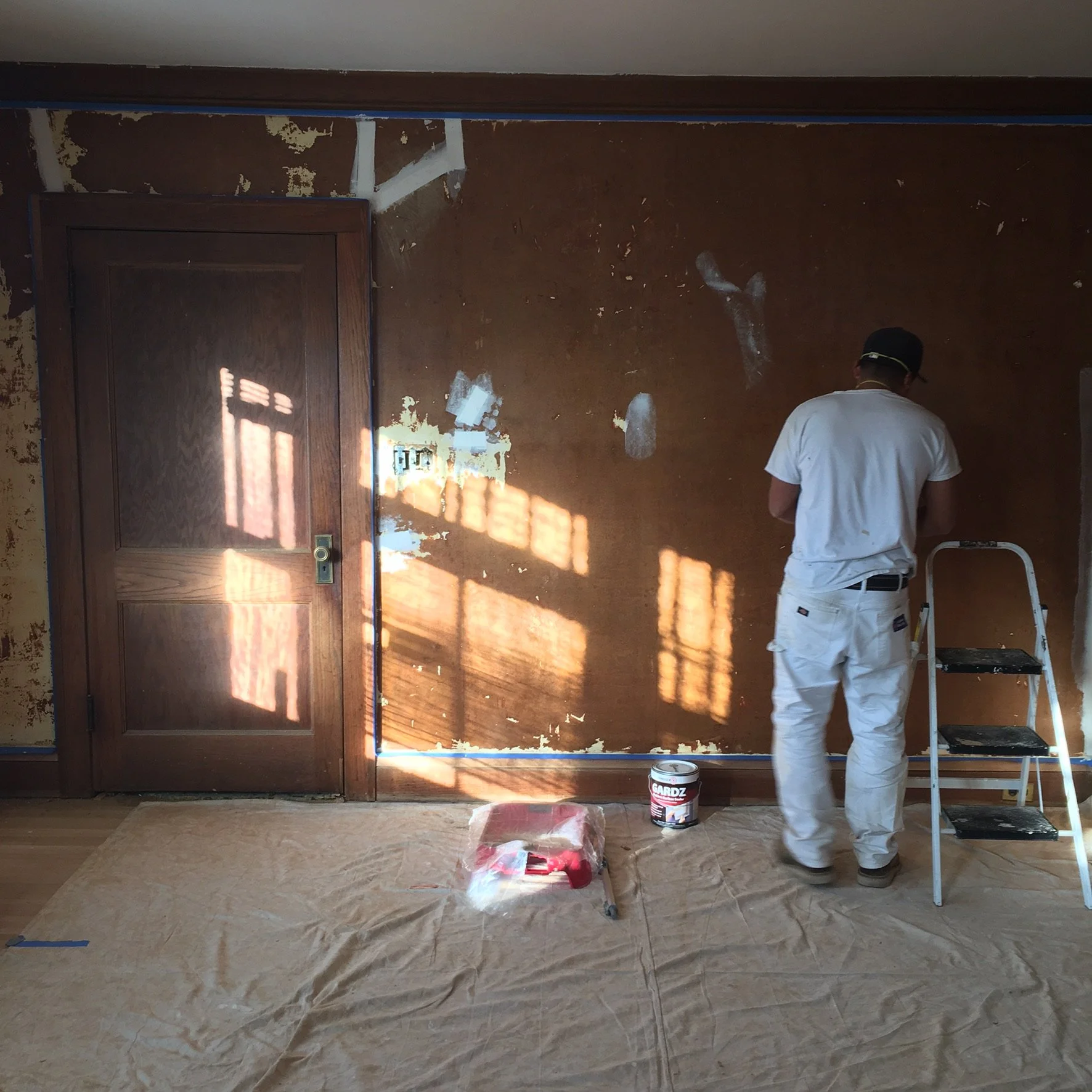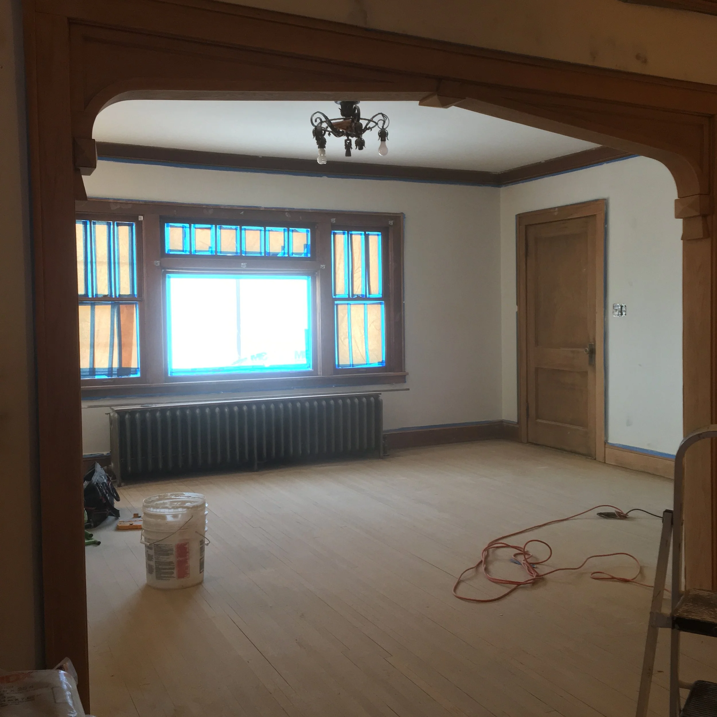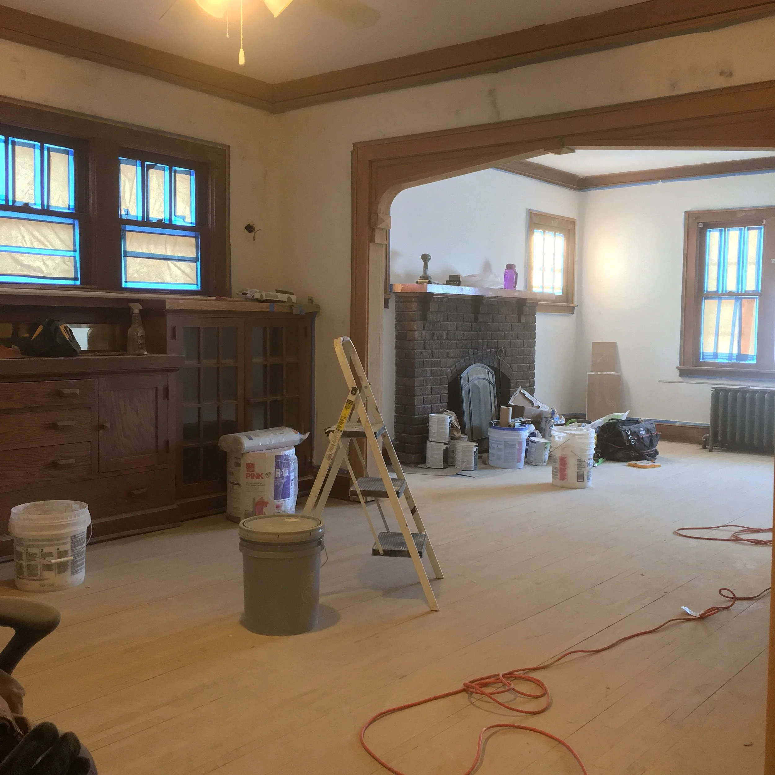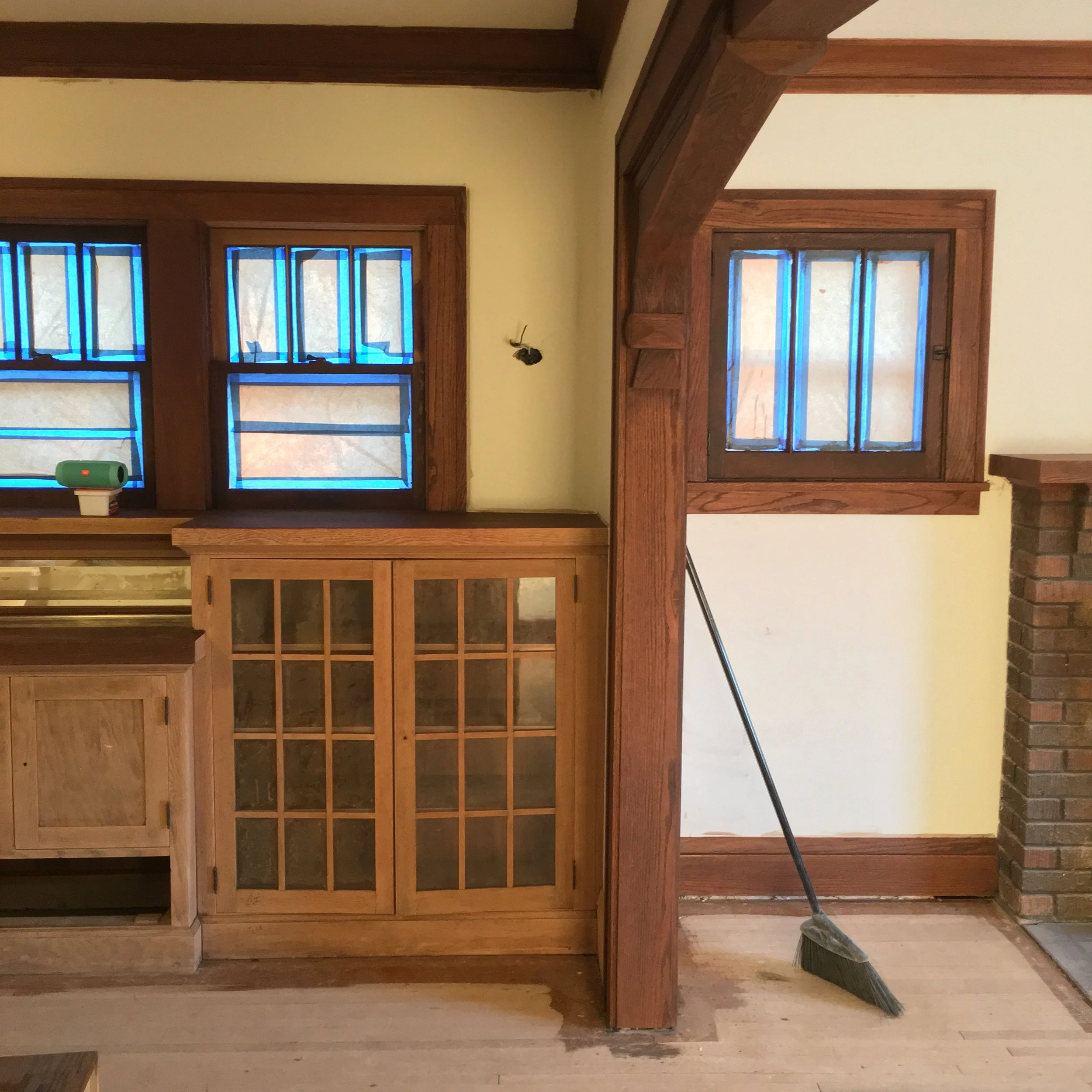 Beginning in 2016, our craft trades embarked on deep-dive revitalization of the 1926 double bungalow. Every square inch of her above ground footage was covered in aged-out wallpaper and checked oil finish that had orange-peeled on the millwork. Sadly we only have a handful of surviving process shots but they depict the stages of plaster and millwork restoration back to better than new condition.